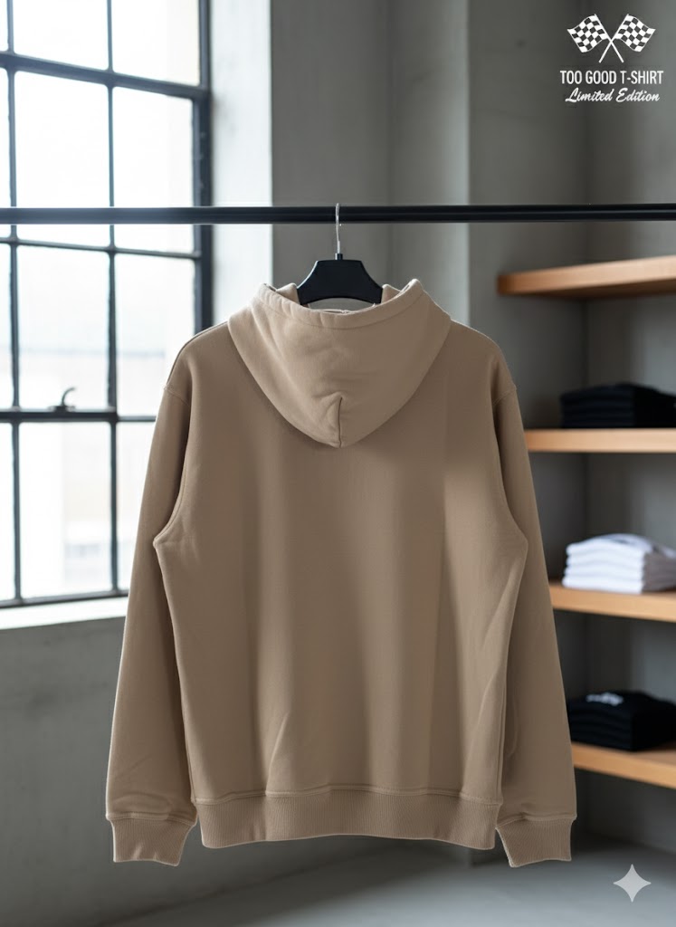 Dieser beige Hoodie zeigt einen schwarzen Muscle Car im Burnout-Look mit dem Schriftzug „TOO GOOD TO STAY IN THE PAST“ – perfekt für Classic-Car-Fans, Schrauber und US-Car-Liebhaber.